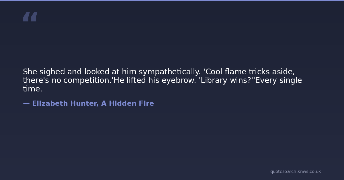 She sighed and looked at him sympathetically. 'Cool flame tricks aside, there's no competition.'He lifted his eyebrow. 'Library wins?''Every single time.