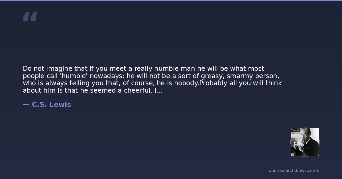 Do not imagine that if you meet a really humble man he will be what most people call 'humble' nowadays: he will not be a sort of greasy, smarmy person, who is always telling you that, of course, he is nobody.Probably all you will think about him is that he seemed a cheerful, intelligent chap who took a real interest in what you said to him.If you do dislike him it will be because you feel a little envious of anyone who seems to enjoy life so easily. He will not be thinking about humility: he will not be thinking about himself at all.