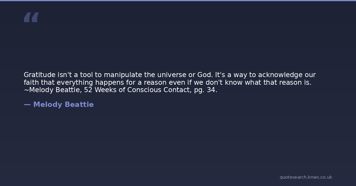 Gratitude isn't a tool to manipulate the universe or God. It's a way to acknowledge our faith that everything happens for a reason even if we don't know what that reason is. ~Melody Beattie, 52 Weeks of Conscious Contact, pg. 34.