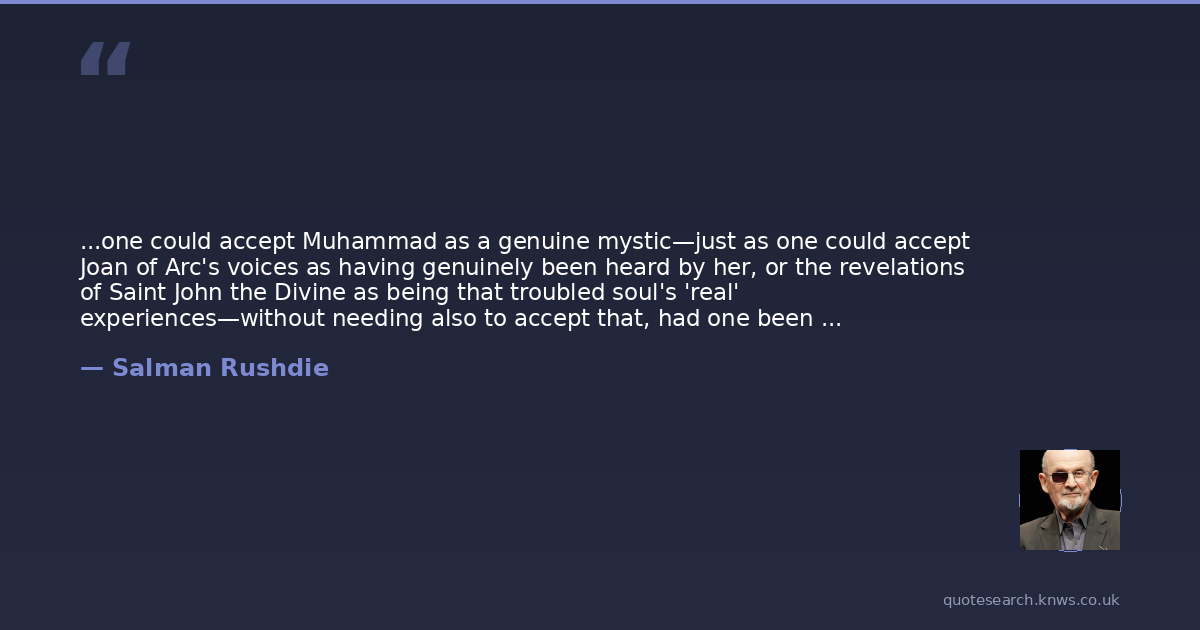 ...one could accept Muhammad as a genuine mystic—just as one could accept Joan of Arc's voices as having genuinely been heard by her, or the revelations of Saint John the Divine as being that troubled soul's 'real' experiences—without needing also to accept that, had one been standing next to the Prophet of Islam on Mount Hira that day, one would also have seen the Archangel.