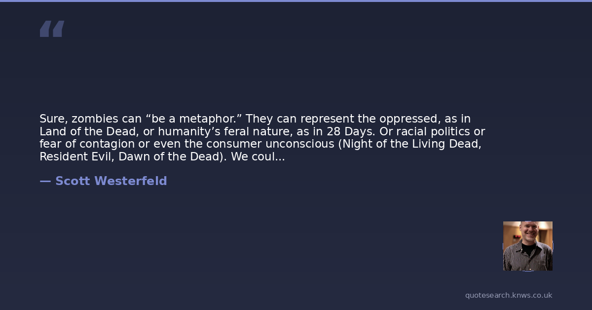 Sure, zombies can “be a metaphor.” They can represent the oppressed, as in Land of the Dead, or humanity’s feral nature, as in 28 Days. Or racial politics or fear of contagion or even the consumer unconscious (Night of the Living Dead, Resident Evil, Dawn of the Dead). We could play this game all night.But really, zombies are not “supposed to be metaphors.” They’re supposed to be friggin’ zombies. They follow the Zombie Rules: they rise from death to eat the flesh of the living, they shuffle in slow pursuit (or should, anyway), and most important, they multiply exponentially. They bring civilization down, taking all but the most resourceful, lucky and well-armed among us, whom they save for last. They make us the hunted; all of us.That’s the stuff zombies are supposed to do. Yes, they make excellent symbols, and metaphors, and have kick-ass mythopoeic resonance to boot. But their main job is to follow genre conventions, to play with and expand the Zombie Rules, to make us begin to see the world as a place colored by our own zombie contingency plans.
