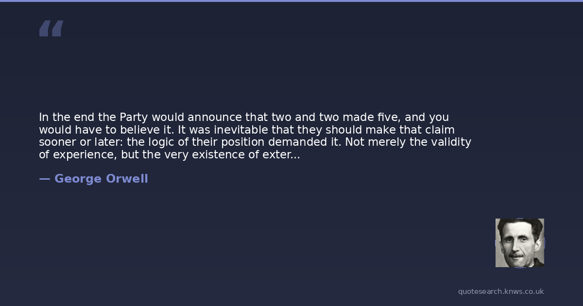 In the end the Party would announce that two and two made five, and you would have to believe it. It was inevitable that they should make that claim sooner or later: the logic of their position demanded it. Not merely the validity of experience, but the very existence of external reality, was tacitly denied by their philosophy. The heresy of heresies was common sense. And what was terrifying was not that they would kill you for thinking otherwise, but that they might be right. For, after all, how do we know that two and two make four? Or that the force of gravity works? Or that the past is unchangeable? If both the past and the external world exist only in the mind, and if the mind itself is controllable—what then?