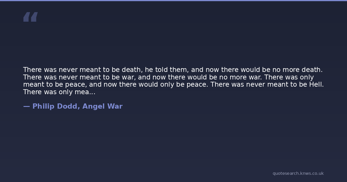 There was never meant to be death, he told them, and now there would be no more death. There was never meant to be war, and now there would be no more war. There was only meant to be peace, and now there would only be peace. There was never meant to be Hell. There was only meant to be Heaven. Now there was no Hell, there was only Heaven. There was only meant to be God. There was never meant to be Satan. Now there was only God, there was no Satan. Hell had to end. It was now on fire and would burn forever. Heaven had now no opposite. It was unopposed. It shone in first light and first colours. The Father's pattern had been broken by Satan, he told them, but now it had been restored. His tapestry had been torn, but now it had been repaired. There was only meant to be love, he reminded them. There was never meant to be hate. Now there was only love. There was no hate. There was only meant to be good. There was never meant to be evil. Now there was only good. There was no evil. The cosmic wheel turned in unhindered harmony, perpetual perfection.