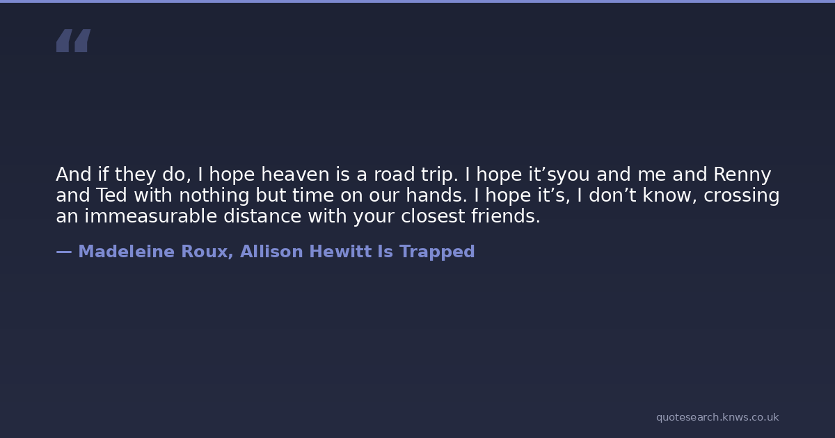 And if they do, I hope heaven is a road trip. I hope it’syou and me and Renny and Ted with nothing but time on our hands. I hope it’s, I don’t know, crossing an immeasurable distance with your closest friends.