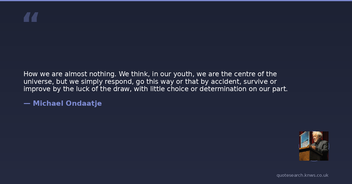 How we are almost nothing. We think, in our youth, we are the centre of the universe, but we simply respond, go this way or that by accident, survive or improve by the luck of the draw, with little choice or determination on our part.