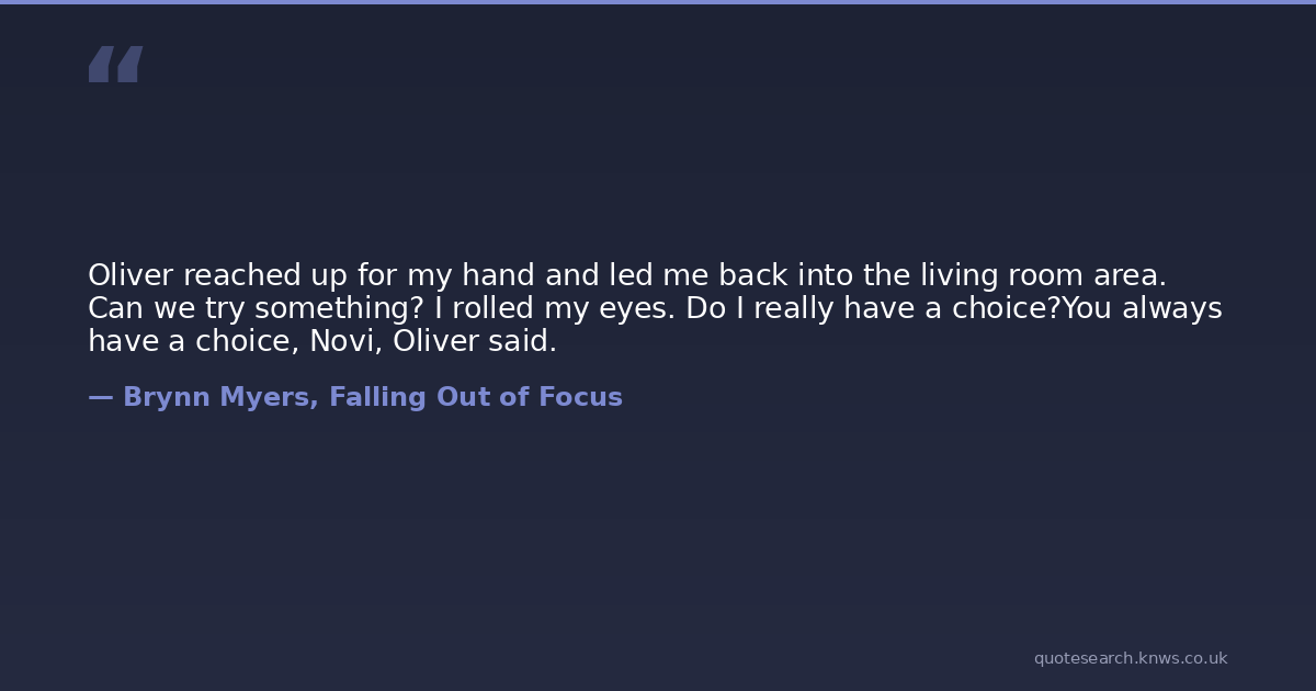 Oliver reached up for my hand and led me back into the living room area. Can we try something? I rolled my eyes. Do I really have a choice?You always have a choice, Novi, Oliver said.
