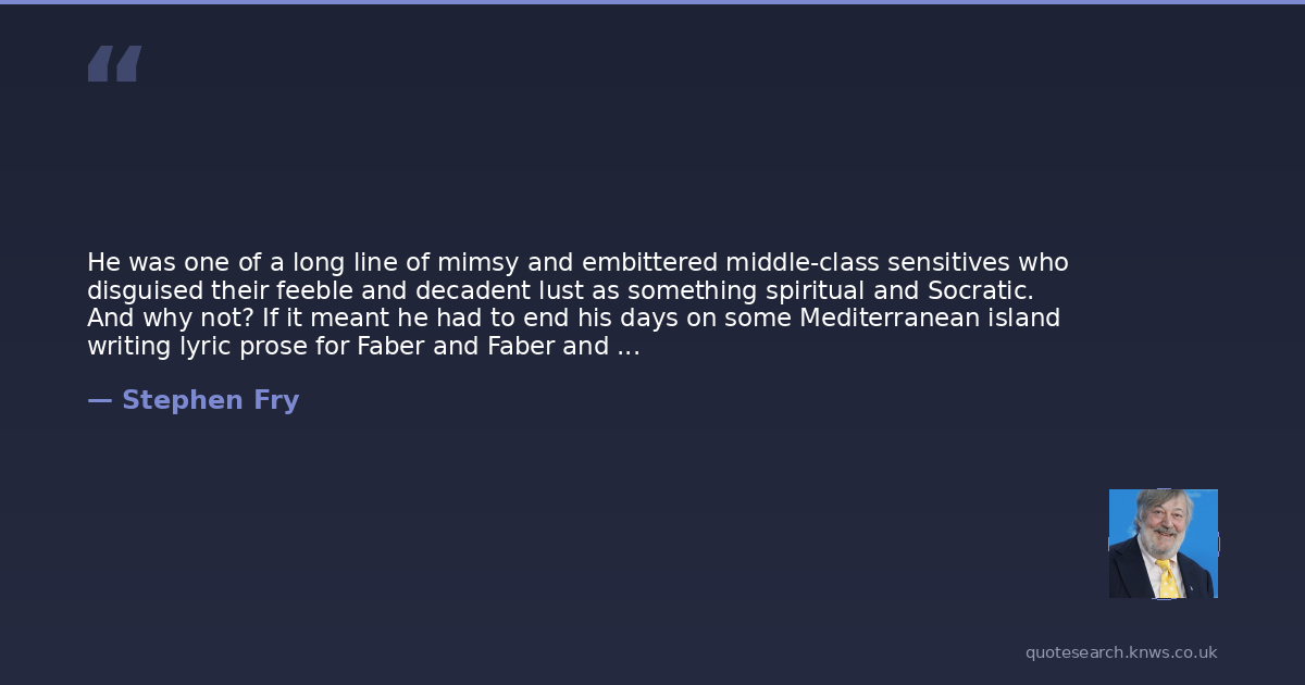 He was one of a long line of mimsy and embittered middle-class sensitives who disguised their feeble and decadent lust as something spiritual and Socratic. And why not? If it meant he had to end his days on some Mediterranean island writing lyric prose for Faber and Faber and literary criticism for the New Statesman, running through successions of houseboys and 'secretaries', getting sloshed on Fernet Branca and having to pay off the Chief of Police every six months, then so be it. Better than driving to the office in the rain.