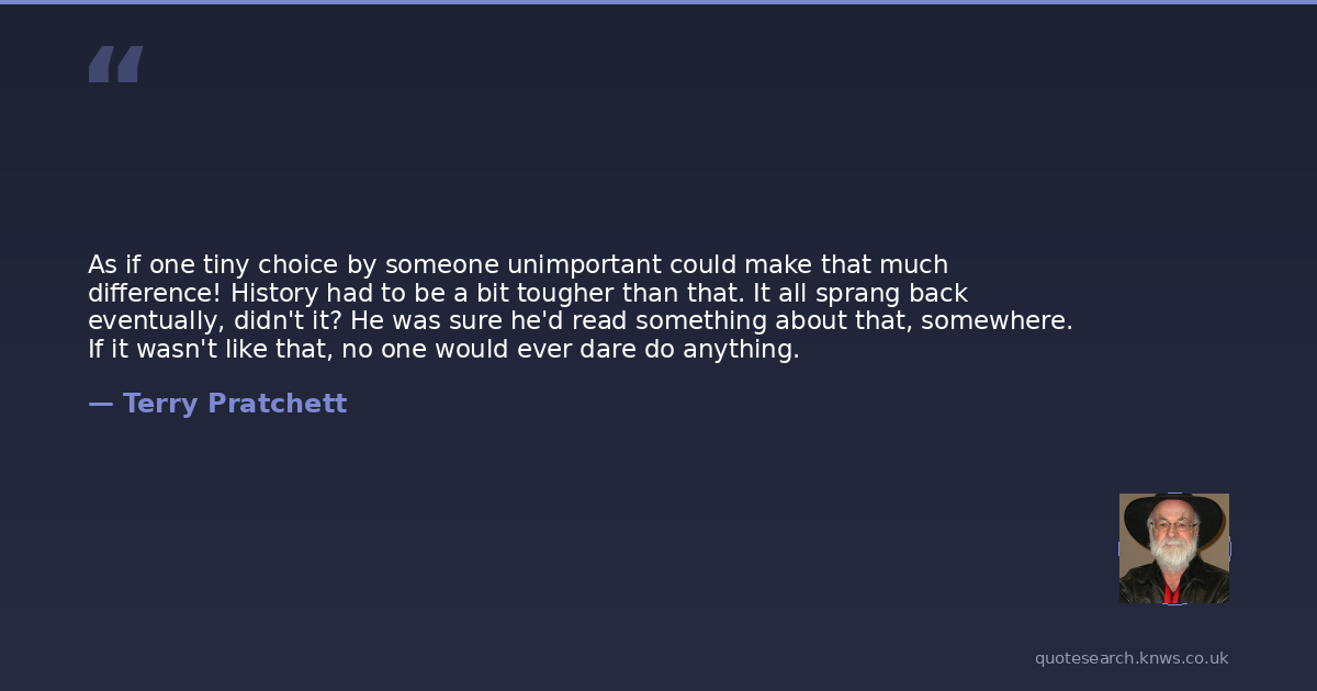 As if one tiny choice by someone unimportant could make that much difference! History had to be a bit tougher than that. It all sprang back eventually, didn't it? He was sure he'd read something about that, somewhere. If it wasn't like that, no one would ever dare do anything.