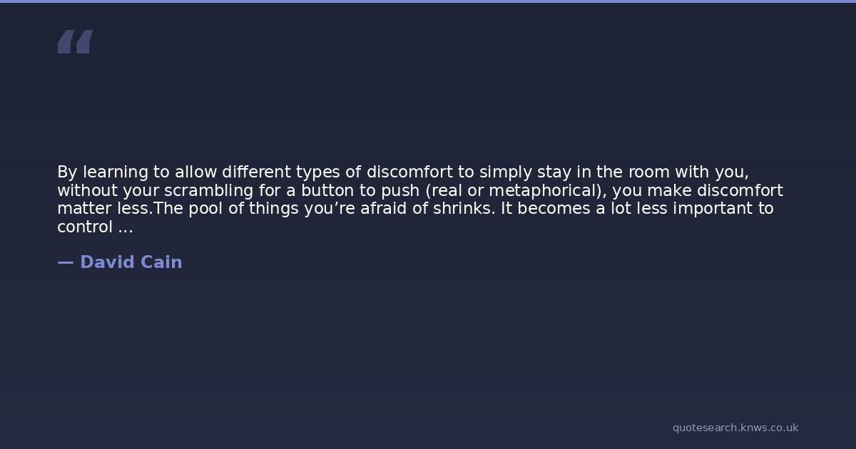 By learning to allow different types of discomfort to simply stay in the room with you, without your scrambling for a button to push (real or metaphorical), you make discomfort matter less.The pool of things you’re afraid of shrinks. It becomes a lot less important to control circumstances, because you know you can handle moments of uncertainty or awkwardness or disappointment without an escape plan.