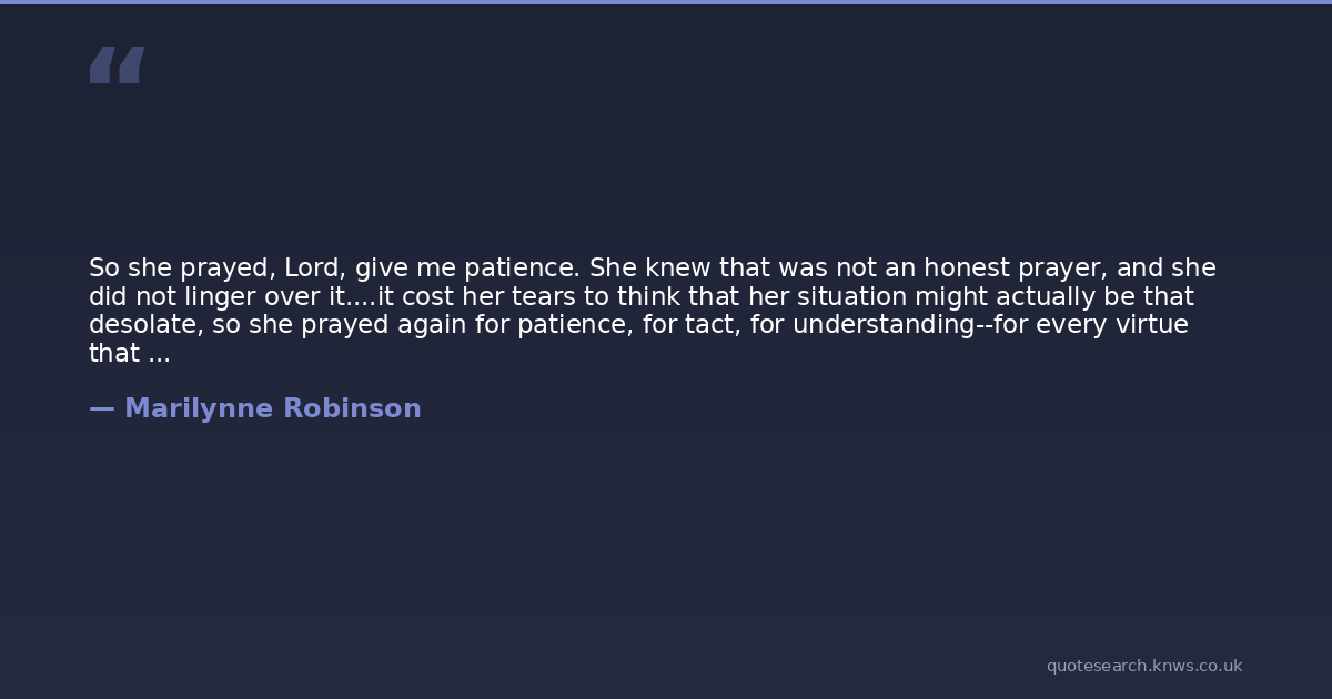 So she prayed, Lord, give me patience. She knew that was not an honest prayer, and she did not linger over it....it cost her tears to think that her situation might actually be that desolate, so she prayed again for patience, for tact, for understanding--for every virtue that might keep her safe from conflicts that would be sure to leave her wounded, every virtue that might at least help her to preserve an appearance of dignity, for heaven's sake.