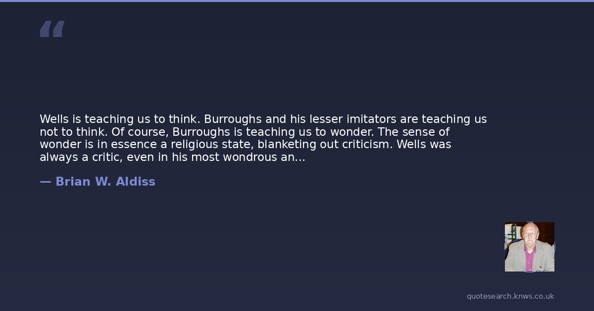 Wells is teaching us to think. Burroughs and his lesser imitators are teaching us not to think. Of course, Burroughs is teaching us to wonder. The sense of wonder is in essence a religious state, blanketing out criticism. Wells was always a critic, even in his most wondrous and romantic tales.And there, I believe, the two poles of modern fantasy stand defined. At one pole wait Wells and his honorable predecessors such as Swift; at the other, Burroughs and the commercial producers, such as Otis Adelbart Kline, and the weirdies, and horror merchants such as H.P. Lovecraft, and so all the way past Tolkien to today's non-stop fantasy worlders. Mary Shelley stands somewhere at the equator of this metaphor.