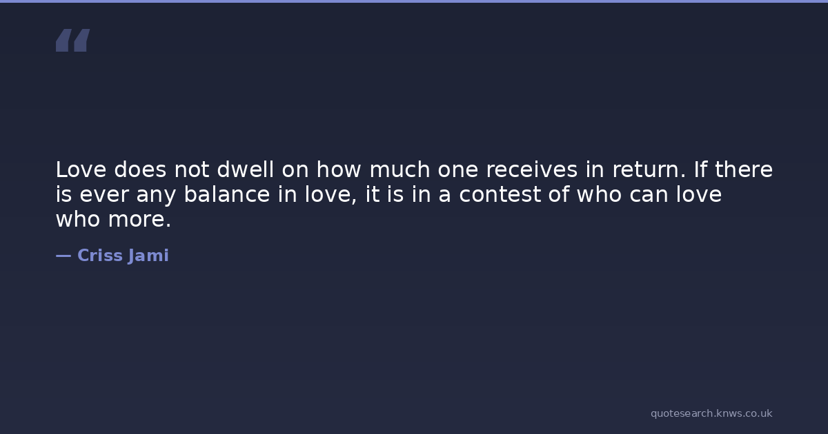 Love does not dwell on how much one receives in return. If there is ever any balance in love, it is in a contest of who can love who more.
