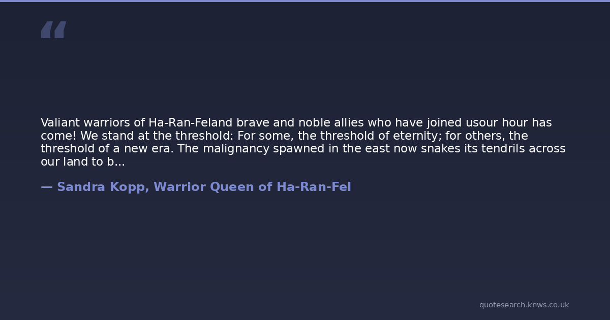 Valiant warriors of Ha-Ran-Feland brave and noble allies who have joined usour hour has come! We stand at the threshold: For some, the threshold of eternity; for others, the threshold of a new era. The malignancy spawned in the east now snakes its tendrils across our land to bind us. . .to choke and extinguish us. . .and to replace our young with its own. It comes not with the conventional weapons of warfare, but with magic and devilry. It comes without honorable rules of engagement, for this is not a fair fight. We know nothing of witchcraft or conjuring demons. We cannot hope to defeat such evil with what we know. But some among us will find the way with what lives in their hearts. They will effect the enemys destruction. From them will victory spring! For those who fall, the light of heaven will shatter the darkness of death! Those who live will see the dawning of a new day, a glad day, a day of peace and freedom! They will multiply and grow mightier than any who ever lived before!WE FIGHT!! King Ruelons final speech.