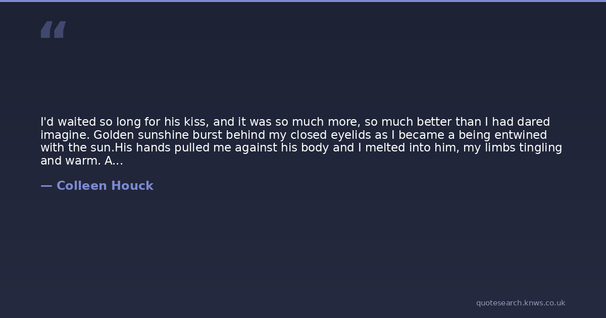 I'd waited so long for his kiss, and it was so much more, so much better than I had dared imagine. Golden sunshine burst behind my closed eyelids as I became a being entwined with the sun.His hands pulled me against his body and I melted into him, my limbs tingling and warm. Amon's mouth moved over mine, slowly, like he could make the kiss last forever.