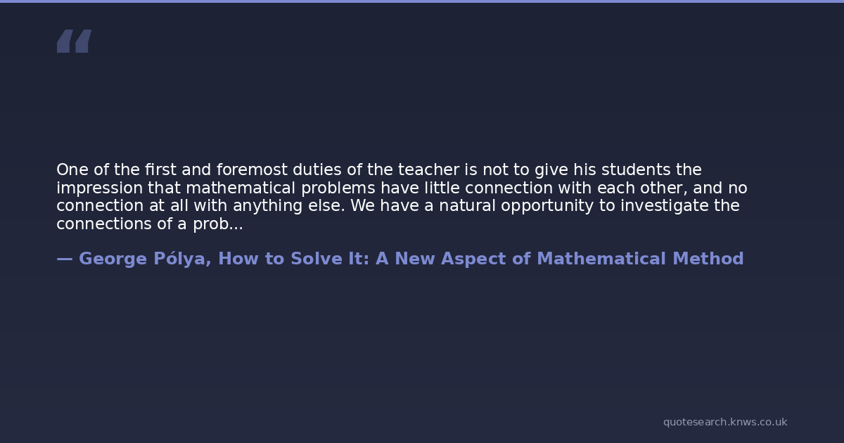 One of the first and foremost duties of the teacher is not to give his students the impression that mathematical problems have little connection with each other, and no connection at all with anything else. We have a natural opportunity to investigate the connections of a problem when looking back at its solution.