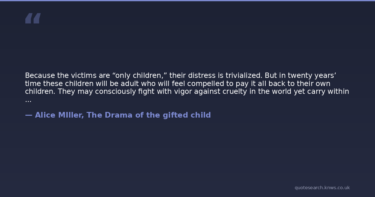 Because the victims are “only children,” their distress is trivialized. But in twenty years’ time these children will be adult who will feel compelled to pay it all back to their own children. They may consciously fight with vigor against cruelty in the world yet carry within themselves an experience of cruelty that they may unconsciously inflict on others. As long as it remains hidden behind their idealized picture of a happy childhood, they will have not awareness of it and will therefore be unable to avoid passing it on.It is absolutely urgent that people become aware of the degree to which this disrespect of children is persistently transmitted from one generation to the next, perpetuating destructive behavior. Someone who slaps or hits another adult or knowingly insults her is aware of hurting her. Even if he doesn’t know why he is doing this, he has some sense of what he is doing. But how often were our parents, and we ourselves toward our own children, unconscious of how painfully, deeply, and abidingly they and we injured a child’s tender, budding self?