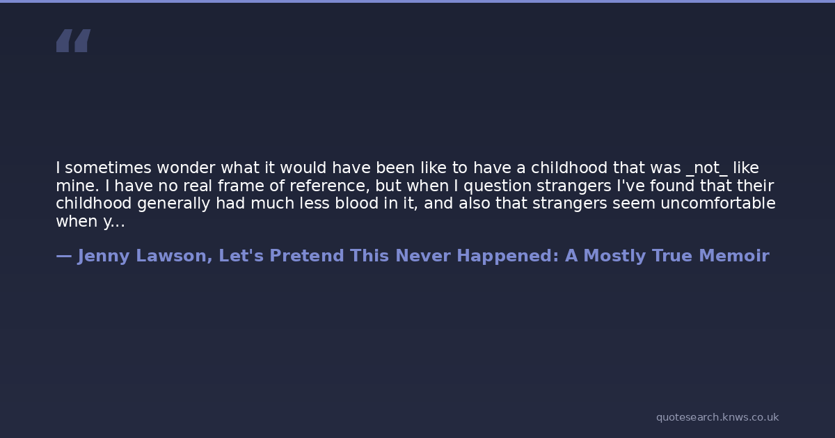 I sometimes wonder what it would have been like to have a childhood that was _not_ like mine. I have no real frame of reference, but when I question strangers I've found that their childhood generally had much less blood in it, and also that strangers seem uncomfortable when you question them about their childhood. But really, what else are you going to talk about in line at the liquor store? Childhood trauma seems like the natural choice, since it's the reason why most of us are in line there to begin with.