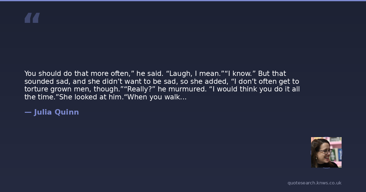 Julia Quinn was American historical romance author. Julie Pottinger, better known by her pen name, Julia Quinn, is an American author. Her novels have been translated into 41 languages and have appeared on The New York Times Bestseller List nineteen times. Read more on Wikipedia →