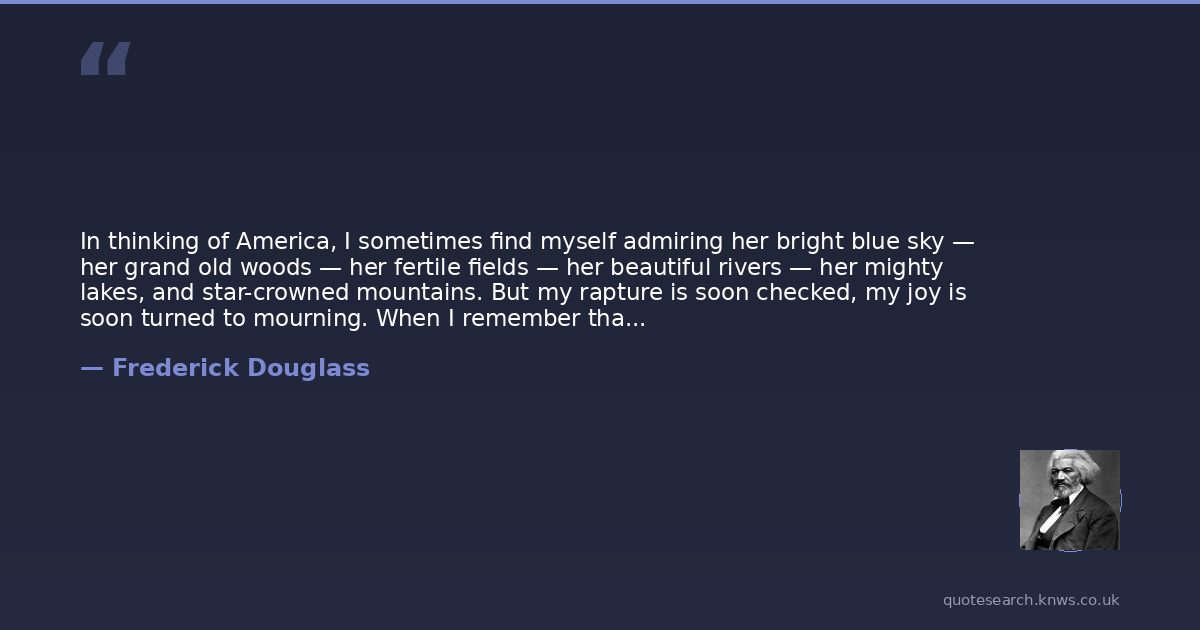 In thinking of America, I sometimes find myself admiring her bright blue sky — her grand old woods — her fertile fields — her beautiful rivers — her mighty lakes, and star-crowned mountains. But my rapture is soon checked, my joy is soon turned to mourning. When I remember that all is cursed with the infernal actions of slaveholding, robbery and wrong, — when I remember that with the waters of her noblest rivers, the tears of my brethren are borne to the ocean, disregarded and forgotten, and that her most fertile fields drink daily of the warm blood of my outraged sisters, I am filled with unutterable loathing.