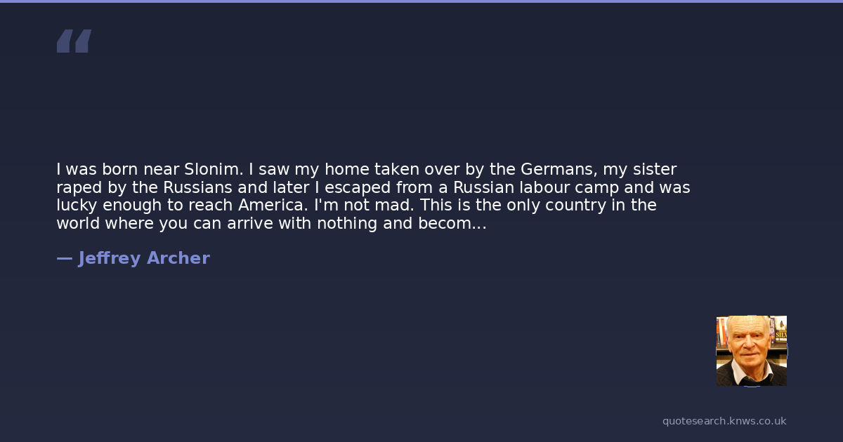 I was born near Slonim. I saw my home taken over by the Germans, my sister raped by the Russians and later I escaped from a Russian labour camp and was lucky enough to reach America. I'm not mad. This is the only country in the world where you can arrive with nothing and become a millionaire though damned hard work regardless of your background.