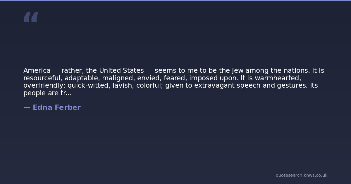 America — rather, the United States — seems to me to be the Jew among the nations. It is resourceful, adaptable, maligned, envied, feared, imposed upon. It is warmhearted, overfriendly; quick-witted, lavish, colorful; given to extravagant speech and gestures. Its people are travelers and wanderers by nature, moving, shifting, restless; swarming in Fords, in ocean liners; craving entertainment; volatile. The schnuckle among the nations of the world.