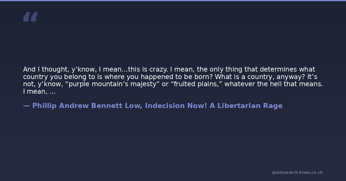 And I thought, y’know, I mean…this is crazy. I mean, the only thing that determines what country you belong to is where you happened to be born? What is a country, anyway? It’s not, y’know, “purple mountain’s majesty” or “fruited plains,” whatever the hell that means. I mean, America isn’t a place, it’s an ideal. It could happen in the Sahara Desert and still be America. For that matter, I’m the child of immigrants. My father’s lived and worked in this country for the past three decades. And he’s somehow more or less American than some redneck who uses Osama bin Laden for toilet paper? How the hell do you measure something like that?