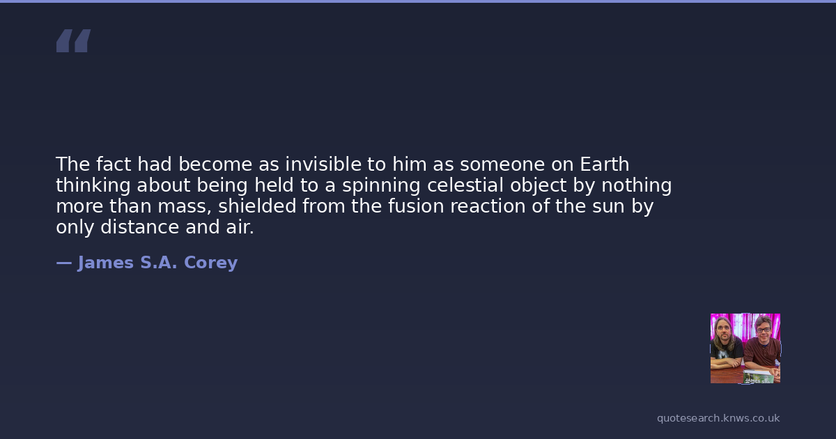 The fact had become as invisible to him as someone on Earth thinking about being held to a spinning celestial object by nothing more than mass, shielded from the fusion reaction of the sun by only distance and air.