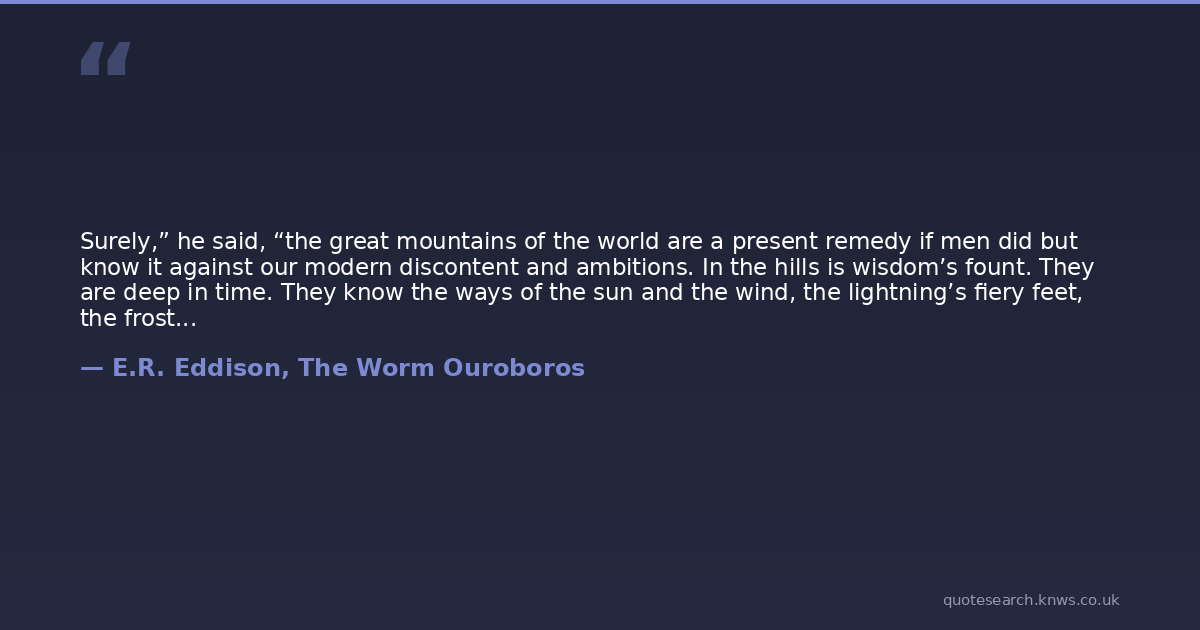 Surely,” he said, “the great mountains of the world are a present remedy if men did but know it against our modern discontent and ambitions. In the hills is wisdom’s fount. They are deep in time. They know the ways of the sun and the wind, the lightning’s fiery feet, the frost that shattereth, the rain that shroudeth, the snow that putteth about their nakedness a softer coverlet than fine lawn.