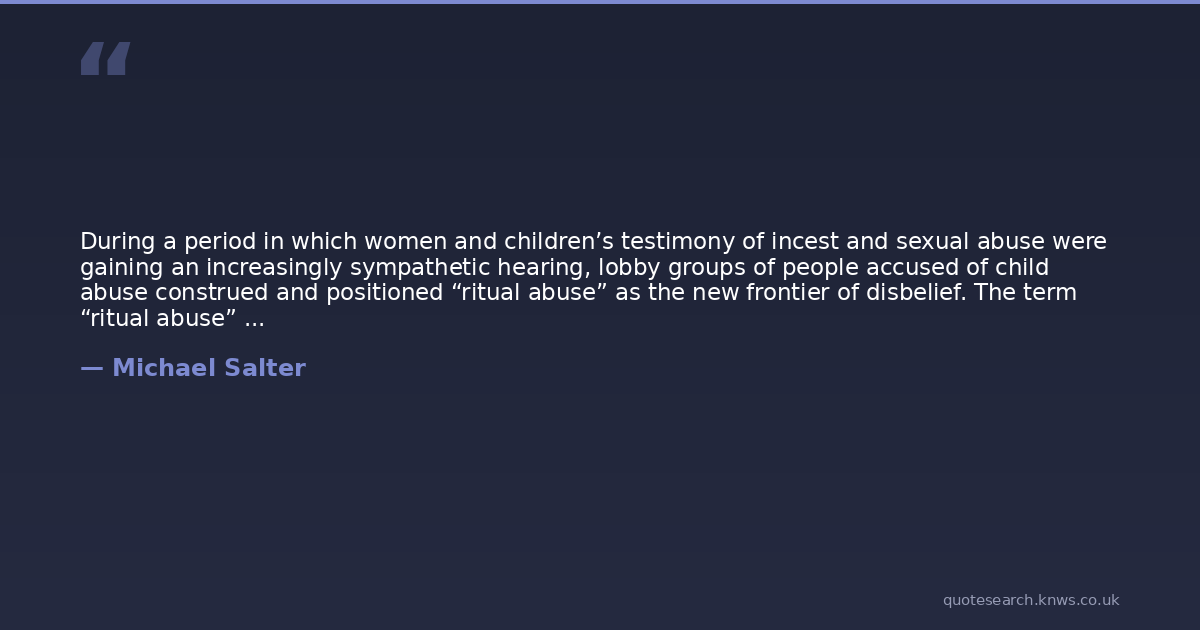 During a period in which women and children’s testimony of incest and sexual abuse were gaining an increasingly sympathetic hearing, lobby groups of people accused of child abuse construed and positioned “ritual abuse” as the new frontier of disbelief. The term “ritual abuse” arose from child protection and psychotherapy practice with adults and children disclosing organized abuse, only to be discursively encircled by backlash groups with the rhetoric of “recovered memories”, “false allegations” and “moral panic”.Salter, M. (2011), Organized abuse and the politics of disbelief.
