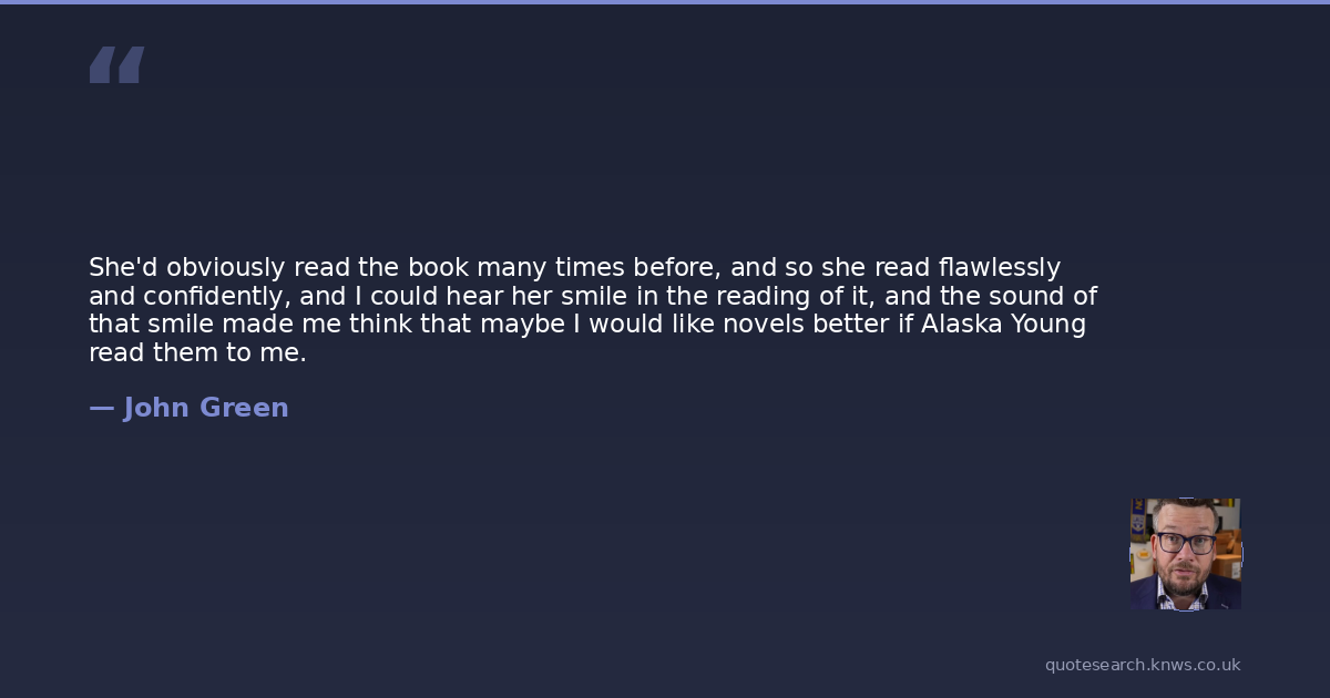 She'd obviously read the book many times before, and so she read flawlessly and confidently, and I could hear her smile in the reading of it, and the sound of that smile made me think that maybe I would like novels better if Alaska Young read them to me.