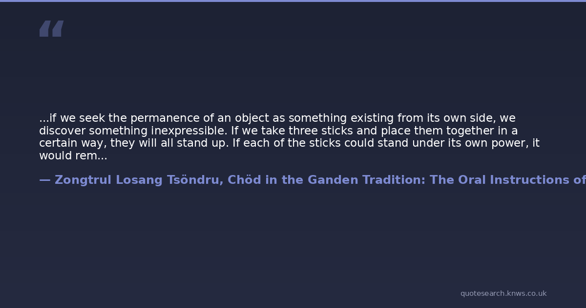 ...if we seek the permanence of an object as something existing from its own side, we discover something inexpressible. If we take three sticks and place them together in a certain way, they will all stand up. If each of the sticks could stand under its own power, it would remain standing even if the others were removed, but they cannot. In this way we must understand dependent arising precisely. Another way of thinking about it is to consider clothing. Only when cloth is of the correct color, shape, and so forth is it labeled "clothing." Or think of a clock. Whenever we see a clock, we label it a clock, but if we were to separate the component pieces, then the "clock" would cease to exist, because no basis of imputation would remain. In actuality there was no truly existent clock in the first place—only the causes and conditions fit to be labeled a "clock.
