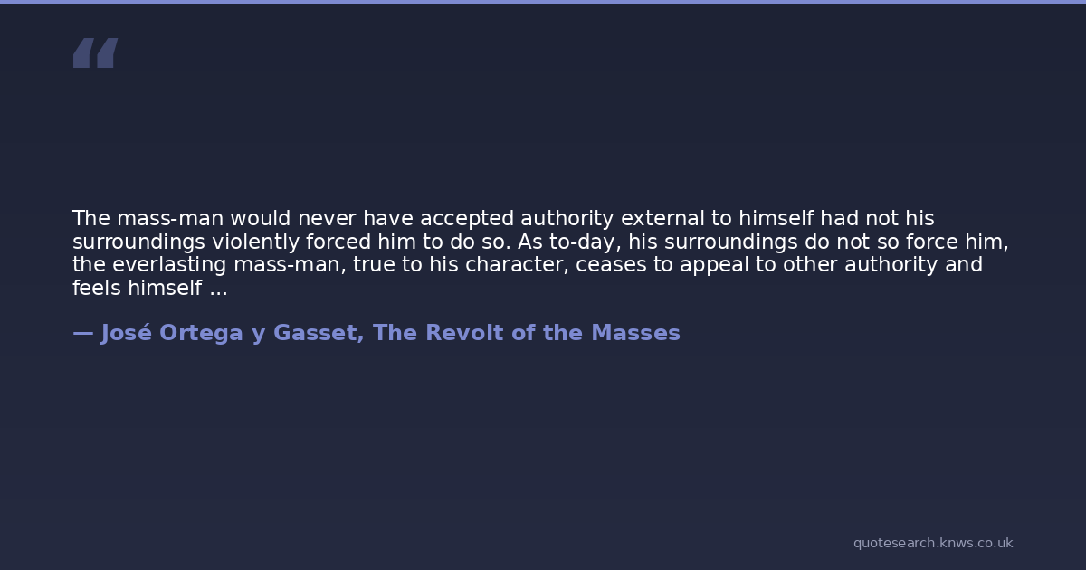The mass-man would never have accepted authority external to himself had not his surroundings violently forced him to do so. As to-day, his surroundings do not so force him, the everlasting mass-man, true to his character, ceases to appeal to other authority and feels himself lord of his own existence. On the contrary the select man, the excellent man is urged, by interior necessity, to appeal from himself to some standard beyond himself, superior to himself, whose service he freely accepts...Contrary to what is usually thought, it is the man of excellence, and not the common man who lives in essential servitude. Life has no savour for him unless he makes it consist in service to something transcendental. Hence he does not look upon the necessity of serving as an oppression. When, by chance, such necessity is lacking, he grows restless and invents some new standard, more difficult, more exigent, with which to coerce himself. This is life lived as a discipline — the noble life.