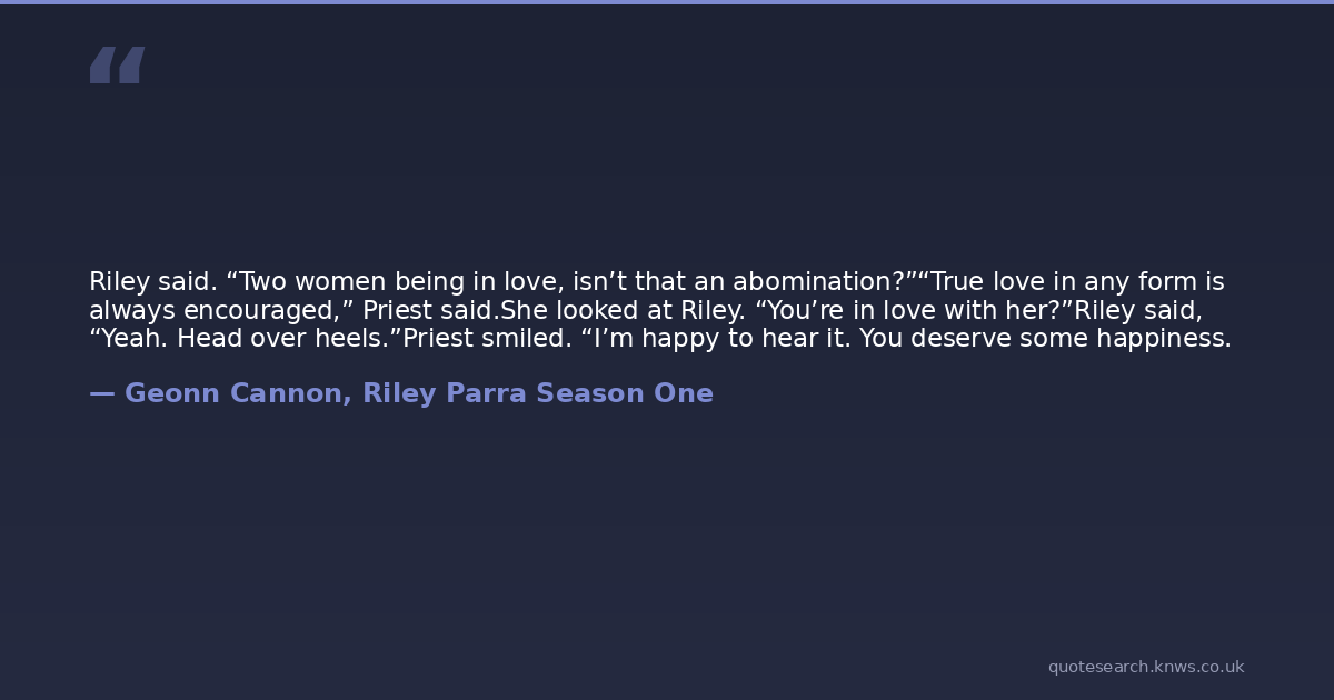 Riley said. “Two women being in love, isn’t that an abomination?”“True love in any form is always encouraged,” Priest said.She looked at Riley. “You’re in love with her?”Riley said, “Yeah. Head over heels.”Priest smiled. “I’m happy to hear it. You deserve some happiness.