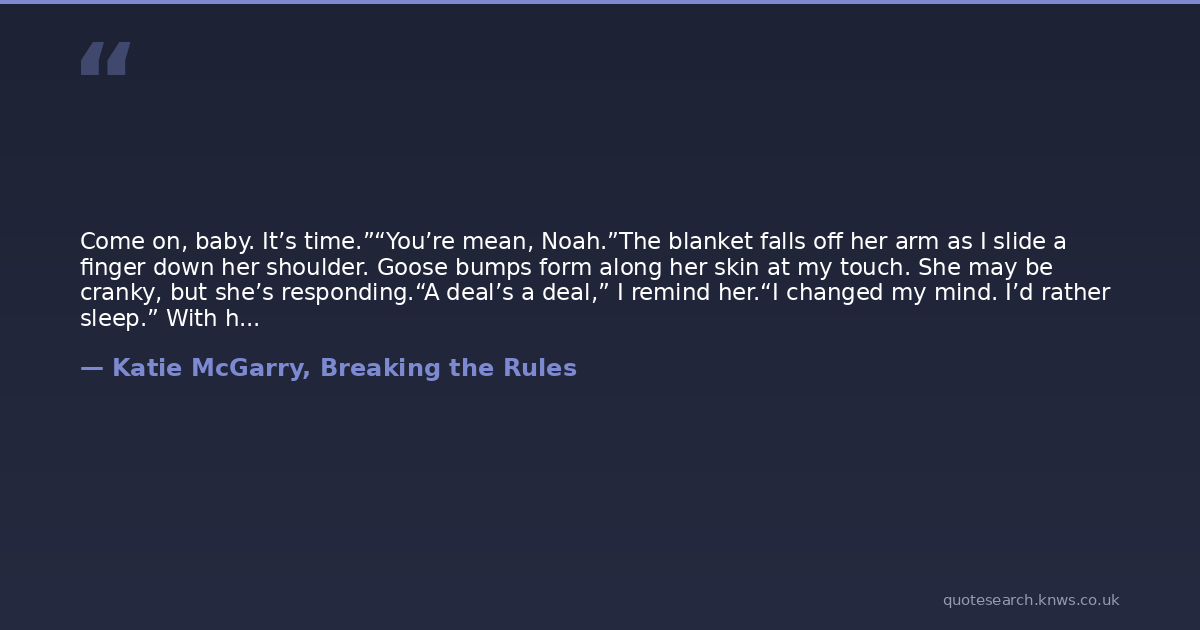 Come on, baby. It’s time.”“You’re mean, Noah.”The blanket falls off her arm as I slide a finger down her shoulder. Goose bumps form along her skin at my touch. She may be cranky, but she’s responding.“A deal’s a deal,” I remind her.“I changed my mind. I’d rather sleep.” With her eyes still shut, she hunts for the cover, but I kick it off. She presses her lips together. “I’m serious. You’re the meanest person I know.”I kiss her neck then blow on the skin, pleased with the smile she’s fighting.“Does that feel mean?” I ask.“Horribly.” She giggles. “It’s torture.