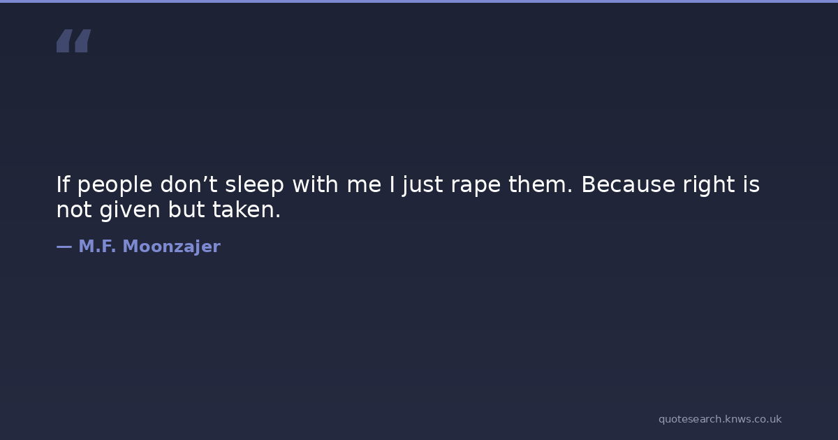 If people don’t sleep with me I just rape them. Because right is not given but taken. given rape sleep taken Download Image Share on X Share on Facebook Copy Link