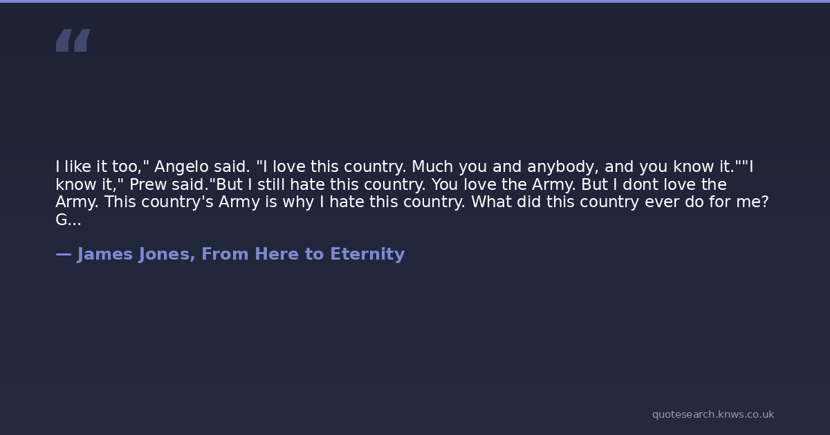 I like it too," Angelo said. "I love this country. Much you and anybody, and you know it.""I know it," Prew said."But I still hate this country. You love the Army. But I dont love the Army. This country's Army is why I hate this country. What did this country ever do for me? Gimme a right to vote for men I cant elect? You can have it. Gimme a right to work at a job I hate? You can have that too. Then tell I'm a Citizen of the greatest richest country on earth, if I dont believe it look at Park Avenue. Carnival prizes. All carnival prizes. [..] They shouldnt teach their immigrants' kids all about democracy unless they mean to let them have a little bit of it, it ony makes for trouble. Me and the United States is dissociating our alliance as of right now, until the United States can find time to read its own textbooks a li