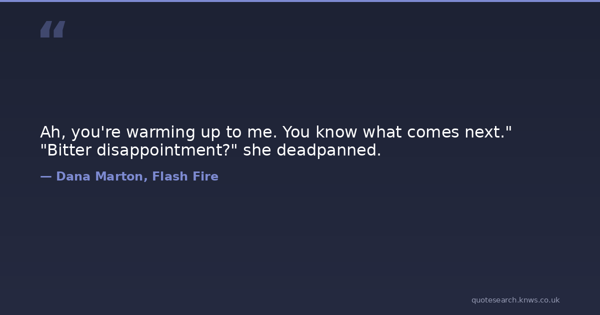 Ah, you're warming up to me. You know what comes next." "Bitter disappointment?" she deadpanned.