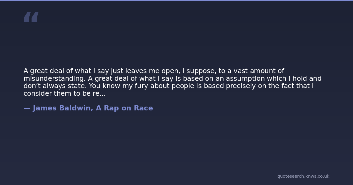 A great deal of what I say just leaves me open, I suppose, to a vast amount of misunderstanding. A great deal of what I say is based on an assumption which I hold and don’t always state. You know my fury about people is based precisely on the fact that I consider them to be responsible, moral creatures who so often do not act that way. But I am not surprised when they do. I am not that wretched a pessimist, and I wouldn’t sound the way I sound if I did not expect what I expect from human beings, if I didn’t have some ultimate faith and love, faith in them and love for them. You see, I am a human being too, and I have no right to stand in judgment of the world as though I am not a part of it. What I am demanding of other people is what I am demanding of myself.