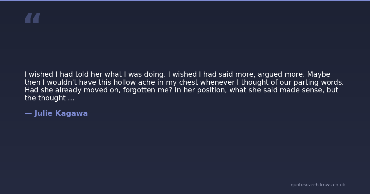 I wished I had told her what I was doing. I wished I had said more, argued more. Maybe then I wouldn't have this hollow ache in my chest whenever I thought of our parting words. Had she already moved on, forgotten me? In her position, what she said made sense, but the thought of her with someone else made me wish I had something to fight, to kill, just so I could forget.