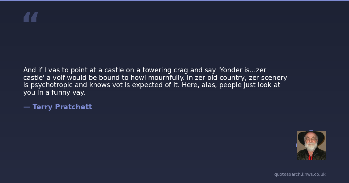 And if I vas to point at a castle on a towering crag and say 'Yonder is...zer castle' a volf would be bound to howl mournfully. In zer old country, zer scenery is psychotropic and knows vot is expected of it. Here, alas, people just look at you in a funny vay.