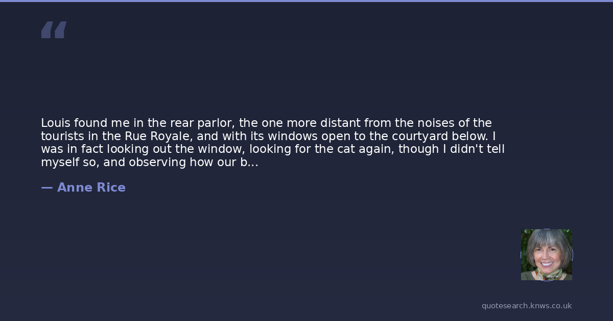 Louis found me in the rear parlor, the one more distant from the noises of the tourists in the Rue Royale, and with its windows open to the courtyard below. I was in fact looking out the window, looking for the cat again, though I didn't tell myself so, and observing how our bougainvillea had all but covered the high walls that enclosed us and kept us safe from the rest of the world. The wisteria was also fierce in its growth, even reaching out from the brick walls to the railing of the rear balcony and finding its way up to the roof. I could never quite take for granted the lush flowers of New Orleans. Indeed, they filled me with happiness whenever I stopped to really look at them and surrender to their fragrance, as though I still had the right to do so, as though I still were part of nature, as though I were still a mortal man.