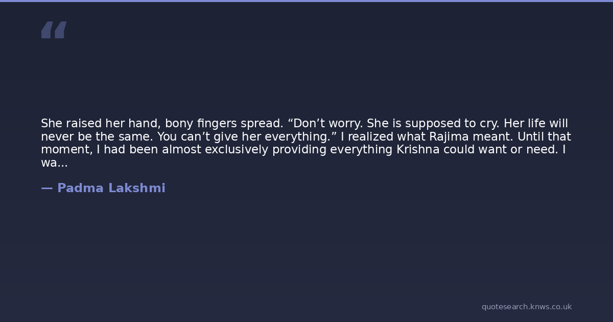 She raised her hand, bony fingers spread. “Don’t worry. She is supposed to cry. Her life will never be the same. You can’t give her everything.” I realized what Rajima meant. Until that moment, I had been almost exclusively providing everything Krishna could want or need. I was her sole succor and haven. But her needs were changing. She would now need sustenance from the earth, from Mother Nature, from the world, or at least Whole Foods. She would need more than what I could give her from my own body. We
