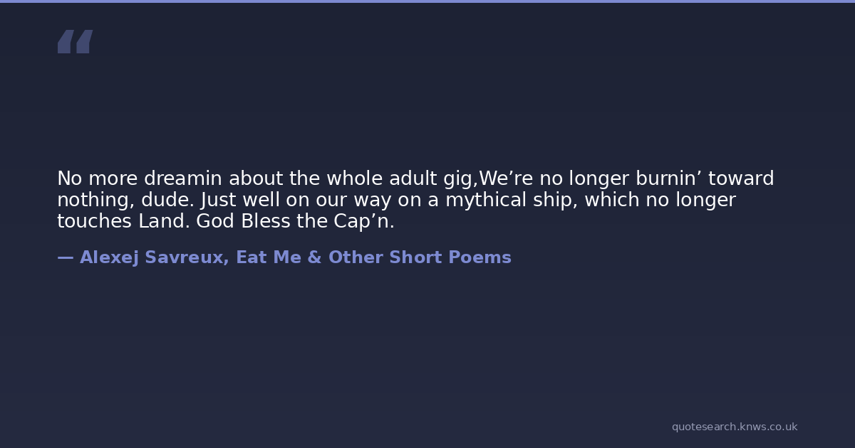 No more dreamin about the whole adult gig,We’re no longer burnin’ toward nothing, dude. Just well on our way on a mythical ship, which no longer touches Land. God Bless the Cap’n.