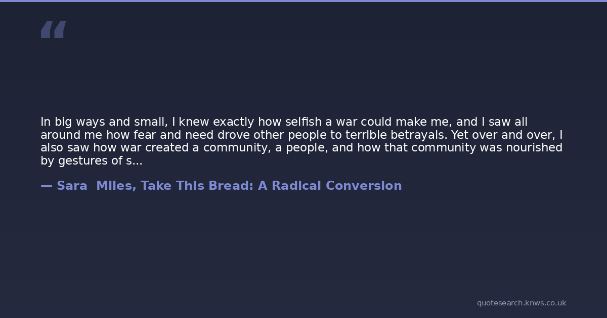 In big ways and small, I knew exactly how selfish a war could make me, and I saw all around me how fear and need drove other people to terrible betrayals. Yet over and over, I also saw how war created a community, a people, and how that community was nourished by gestures of sharing. It was sharing that didn't depend on personal intimacy, and a community that didn't depend on everyone's being friends; it foreshadowed what I would come to understand as church, at its best.