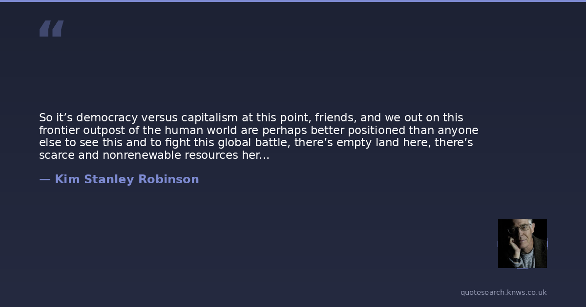 Kim Stanley Robinson was a contemporary American science fiction writer. Kim Stanley Robinson is an American science fiction writer best known for his Mars trilogy of novels. Many of his novels and stories have ecological, cultural, and political themes, featuring scientists as heroes. Read more on Wikipedia →