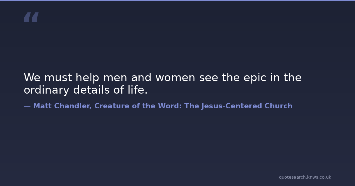 We must help men and women see the epic in the ordinary details of life. boredom discipleship disillusionment evangelism inspiration spiritual-leadership Download Image Share on X Share on Facebook Copy Link