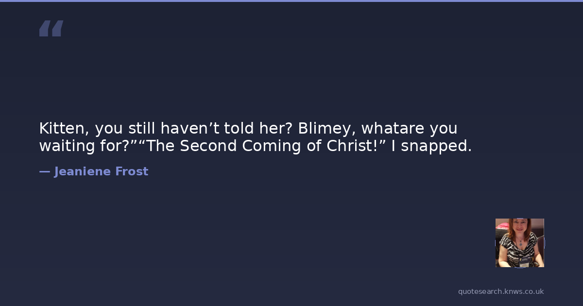 Kitten, you still haven’t told her? Blimey, whatare you waiting for?”“The Second Coming of Christ!” I snapped.