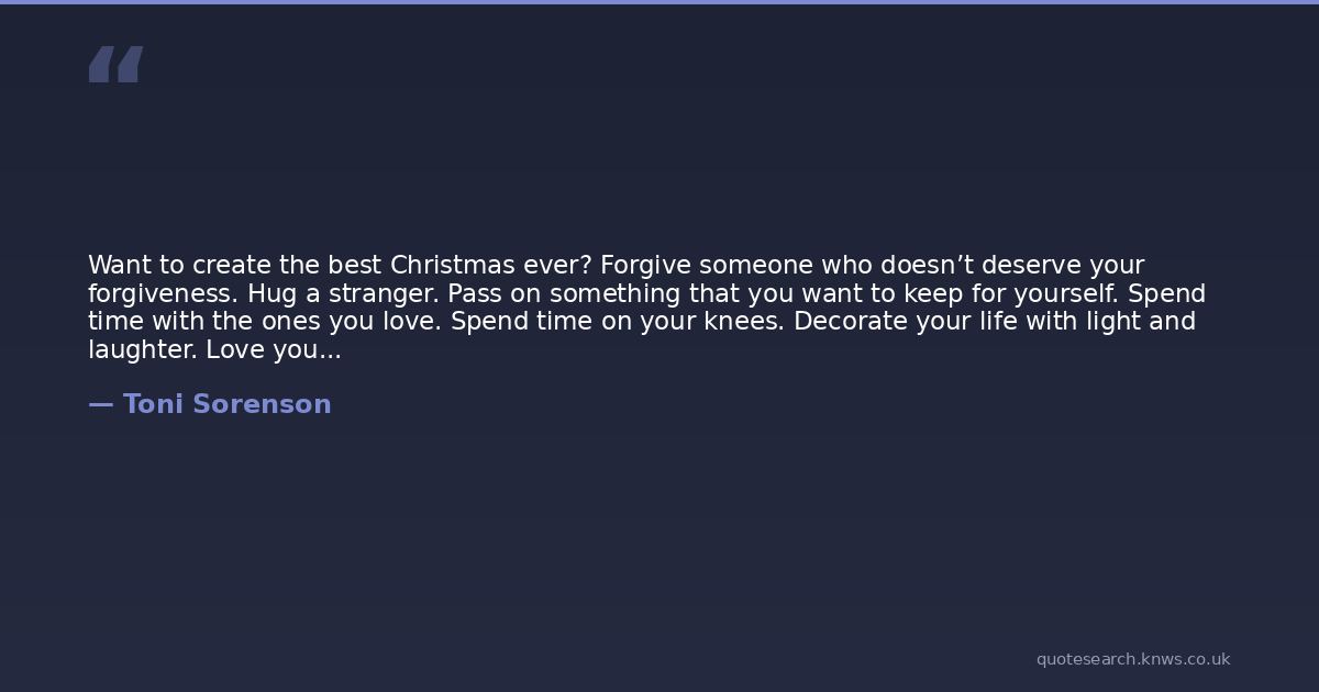 Want to create the best Christmas ever? Forgive someone who doesn’t deserve your forgiveness. Hug a stranger. Pass on something that you want to keep for yourself. Spend time with the ones you love. Spend time on your knees. Decorate your life with light and laughter. Love yourself while you’re loving others. Christmas is about Christ and Christ is all about your joy and happiness.