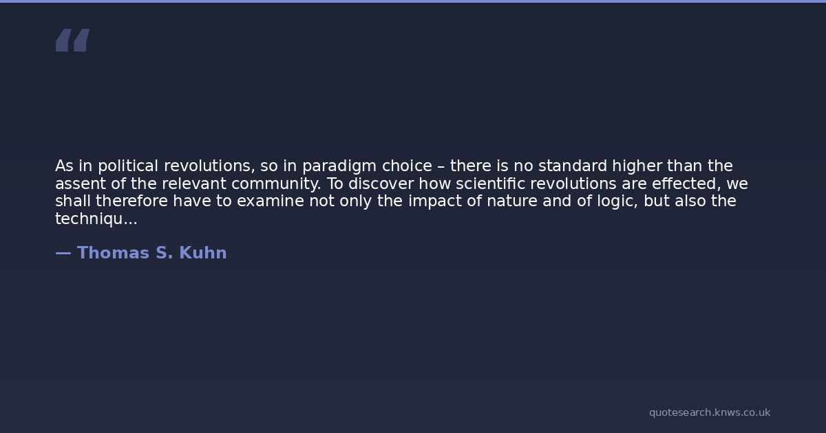 As in political revolutions, so in paradigm choice – there is no standard higher than the assent of the relevant community. To discover how scientific revolutions are effected, we shall therefore have to examine not only the impact of nature and of logic, but also the techniques of persuasive argumentation effective within the quite special groups that constitute the community of scientists.