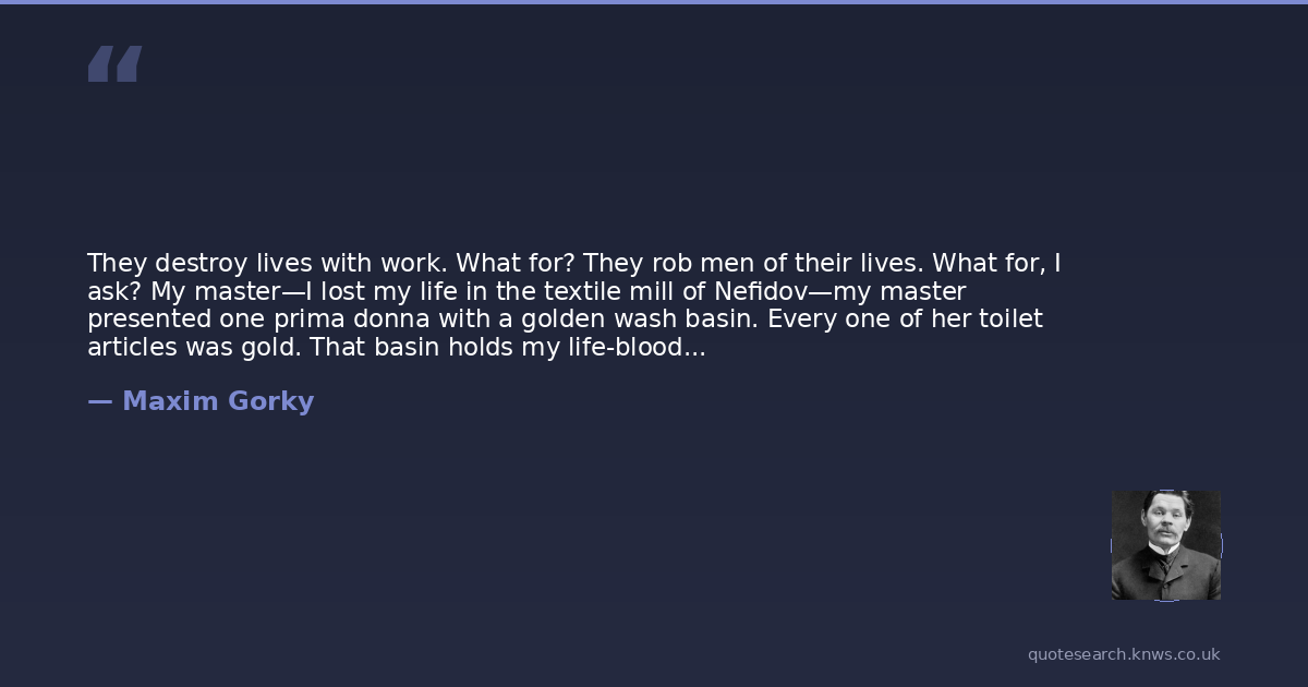 They destroy lives with work. What for? They rob men of their lives. What for, I ask? My master—I lost my life in the textile mill of Nefidov—my master presented one prima donna with a golden wash basin. Every one of her toilet articles was gold. That basin holds my life-blood, my very life. That's for what my life went! A man killed me with work in order to comfort his mistress with my blood. He bought her a gold wash basin with my blood.